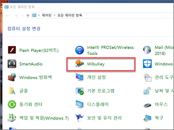 고객의 컴퓨터에서 제어판 > WibuKey 실행 (윈도우 10 기준)