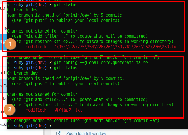 git status 명령어 실행 결과 한글 파일명이 깨져서 나오는 경우 해결 방법
